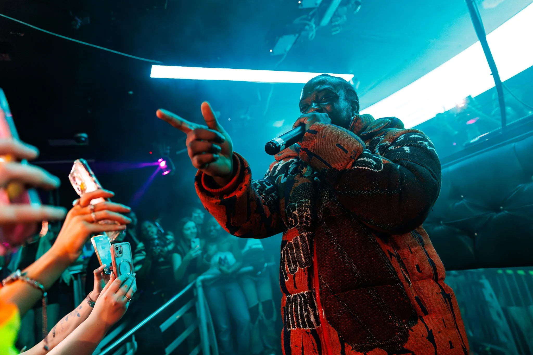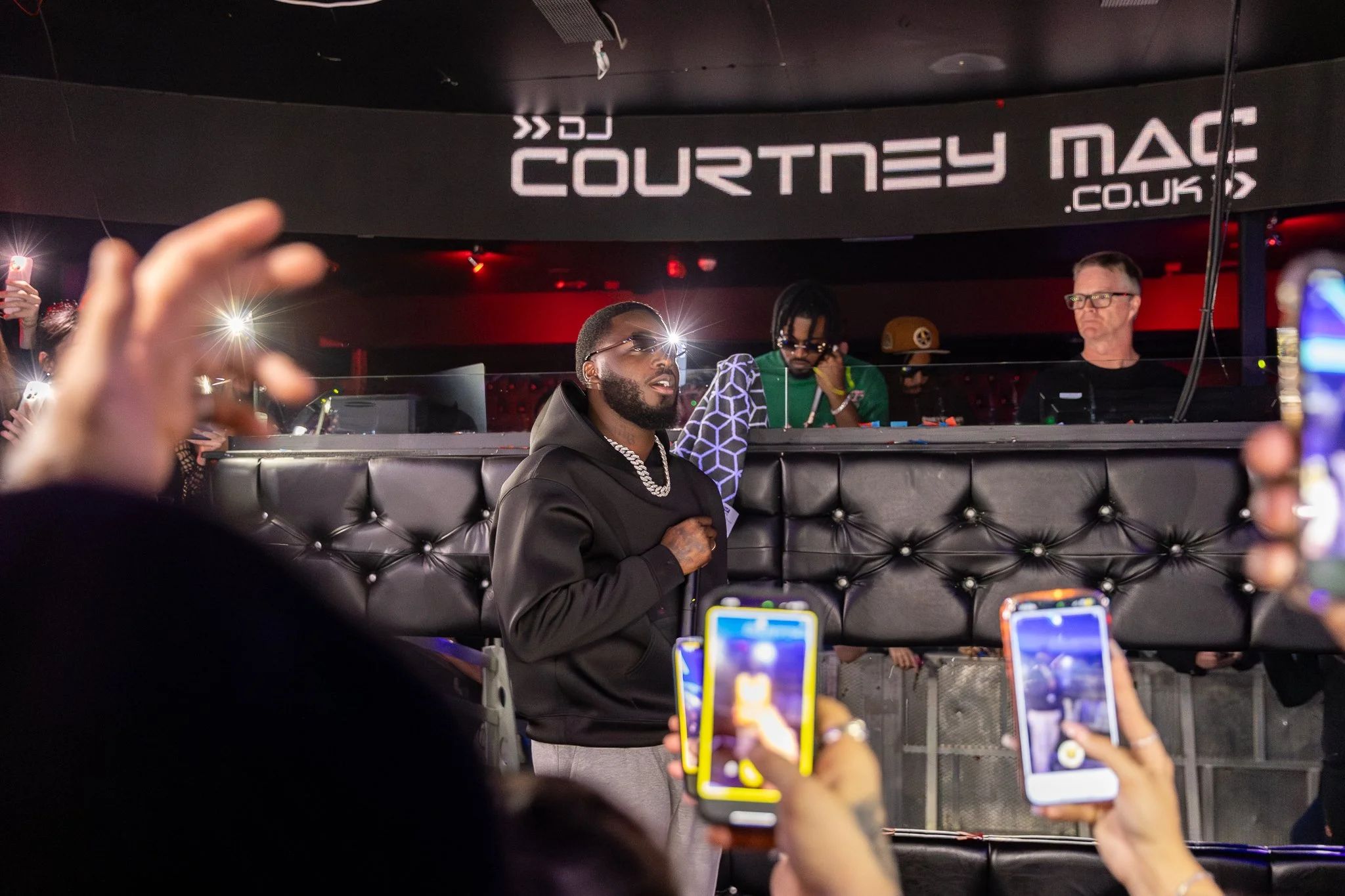 A man wearing sunglasses and a chain performs in a nightclub with a DJ booth in the background labeled "DJ Courtney Mac." Several attendees hold up phones, capturing the moment.