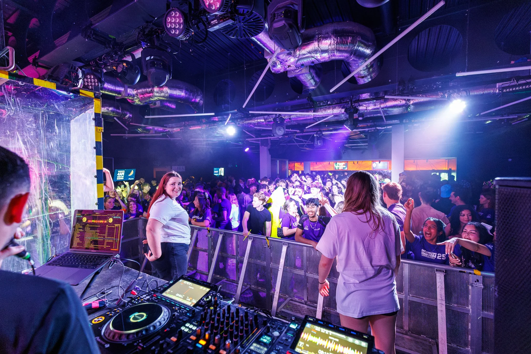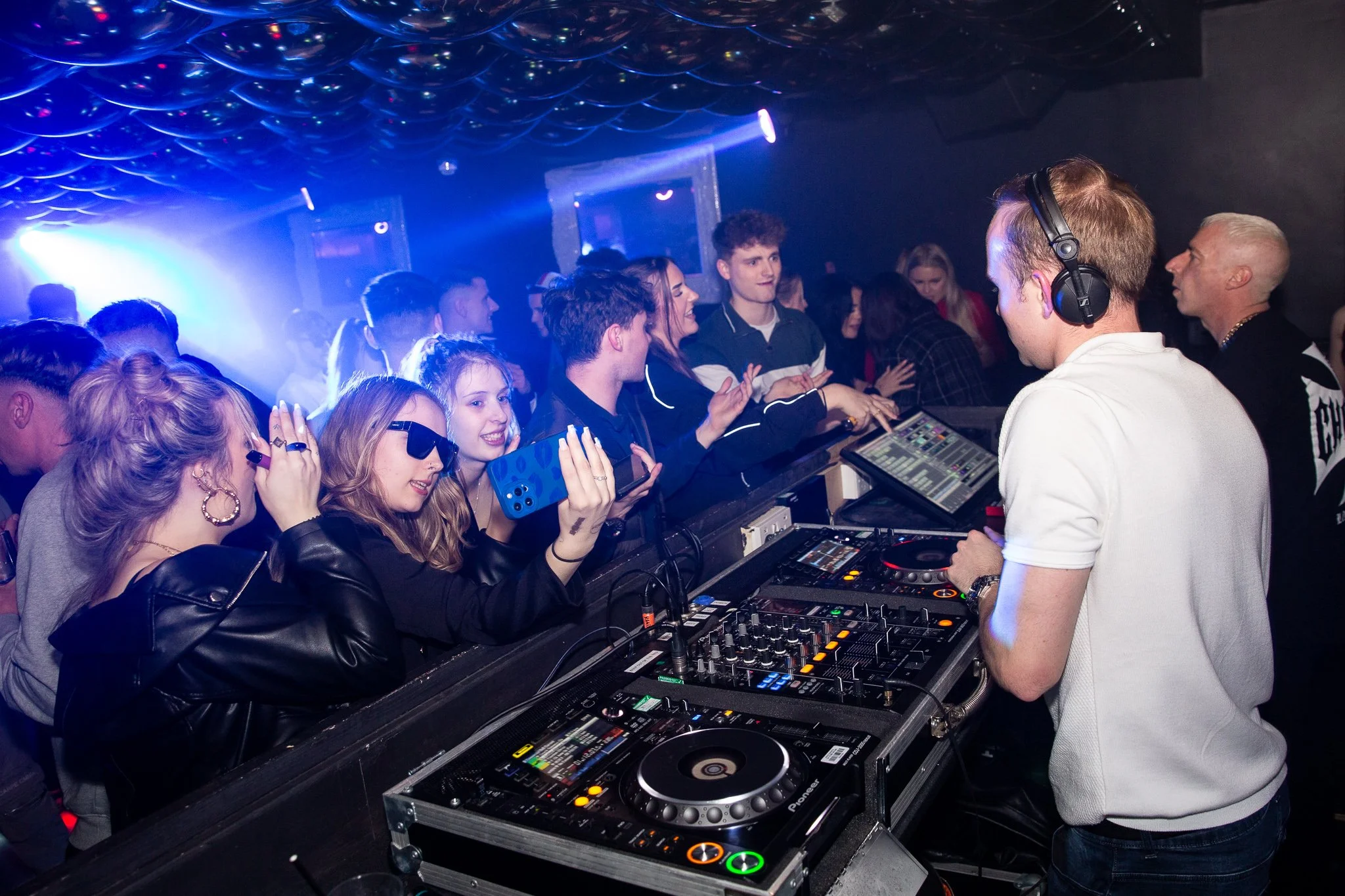 A DJ performing at a nightclub with a crowd of people dancing and taking photos, surrounded by DJ equipment and colorful lighting.