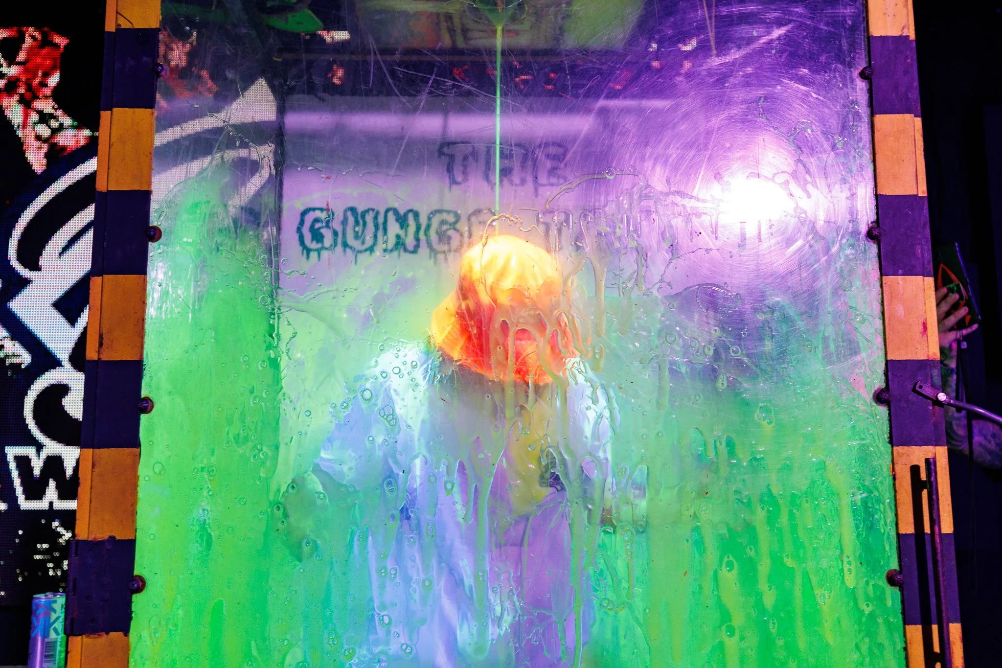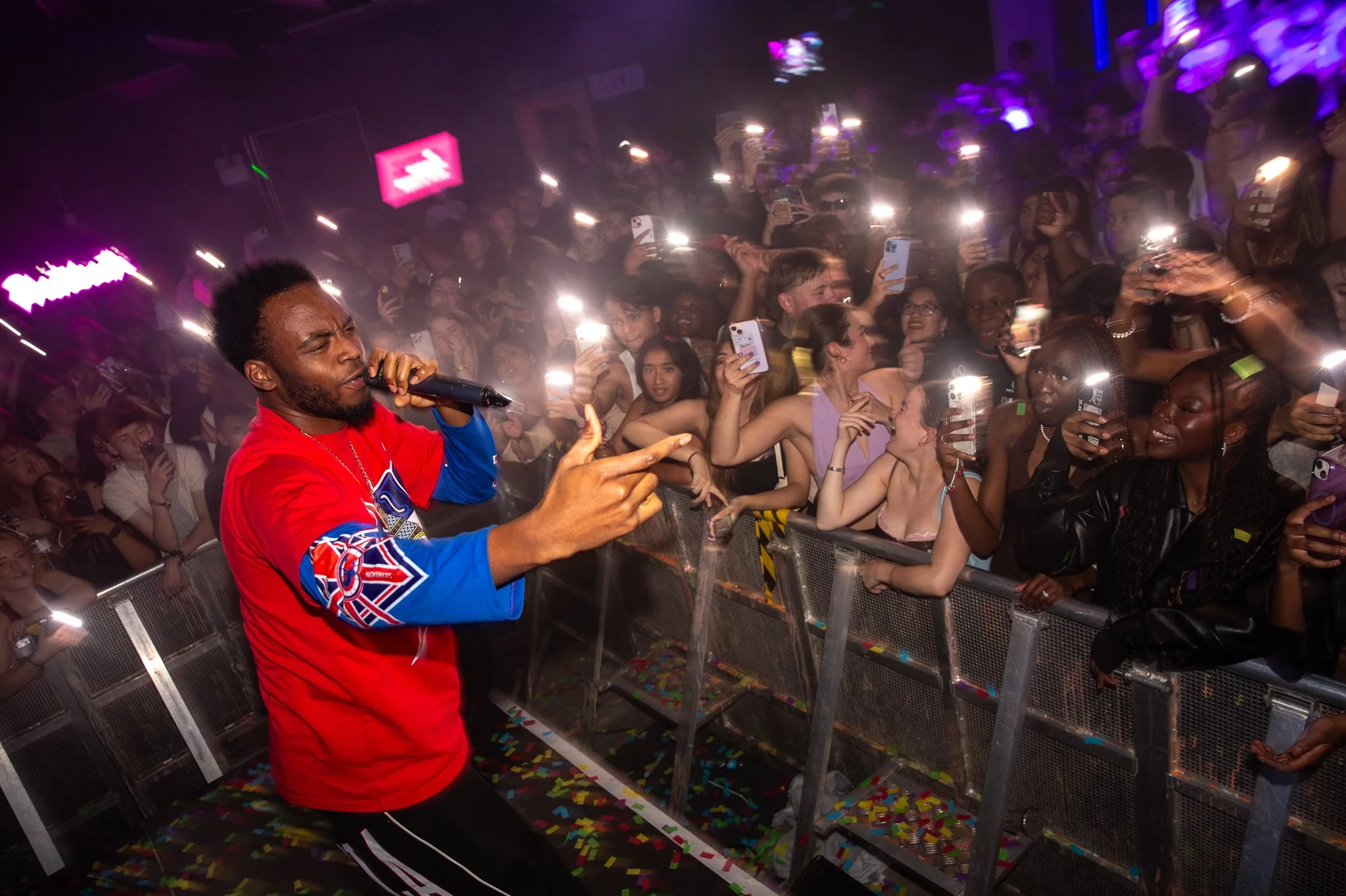 Musician performing on stage in a nightclub, surrounded by a lively crowd taking photos, with colorful lights and confetti on the floor.