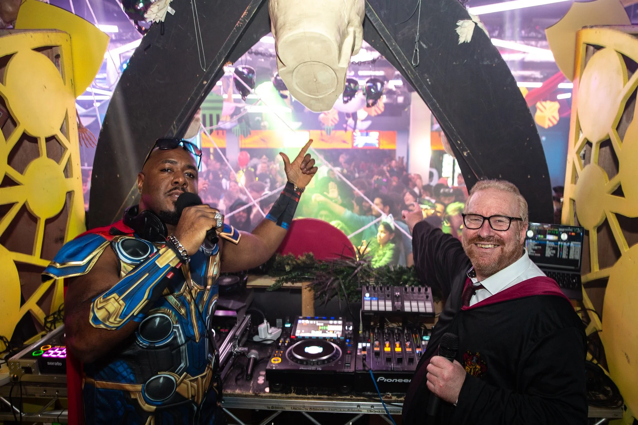 Two men in costumes stand at a DJ booth in a crowded party with colorful lights. One wears a superhero costume and holds a microphone, while the other is in wizard-like attire, smiling and pointing towards the partygoers.