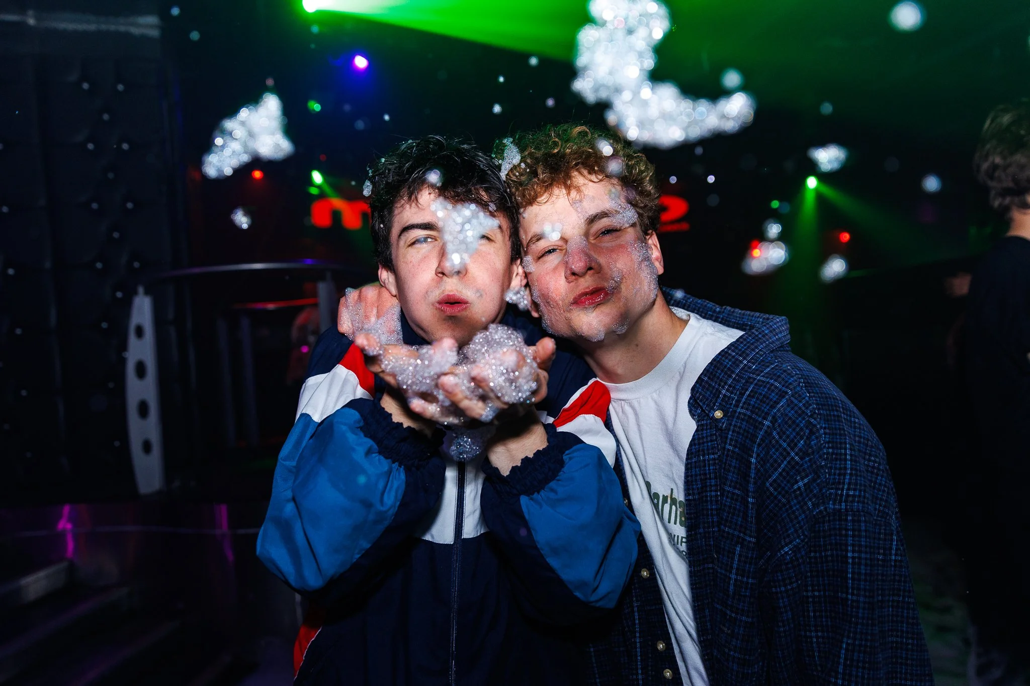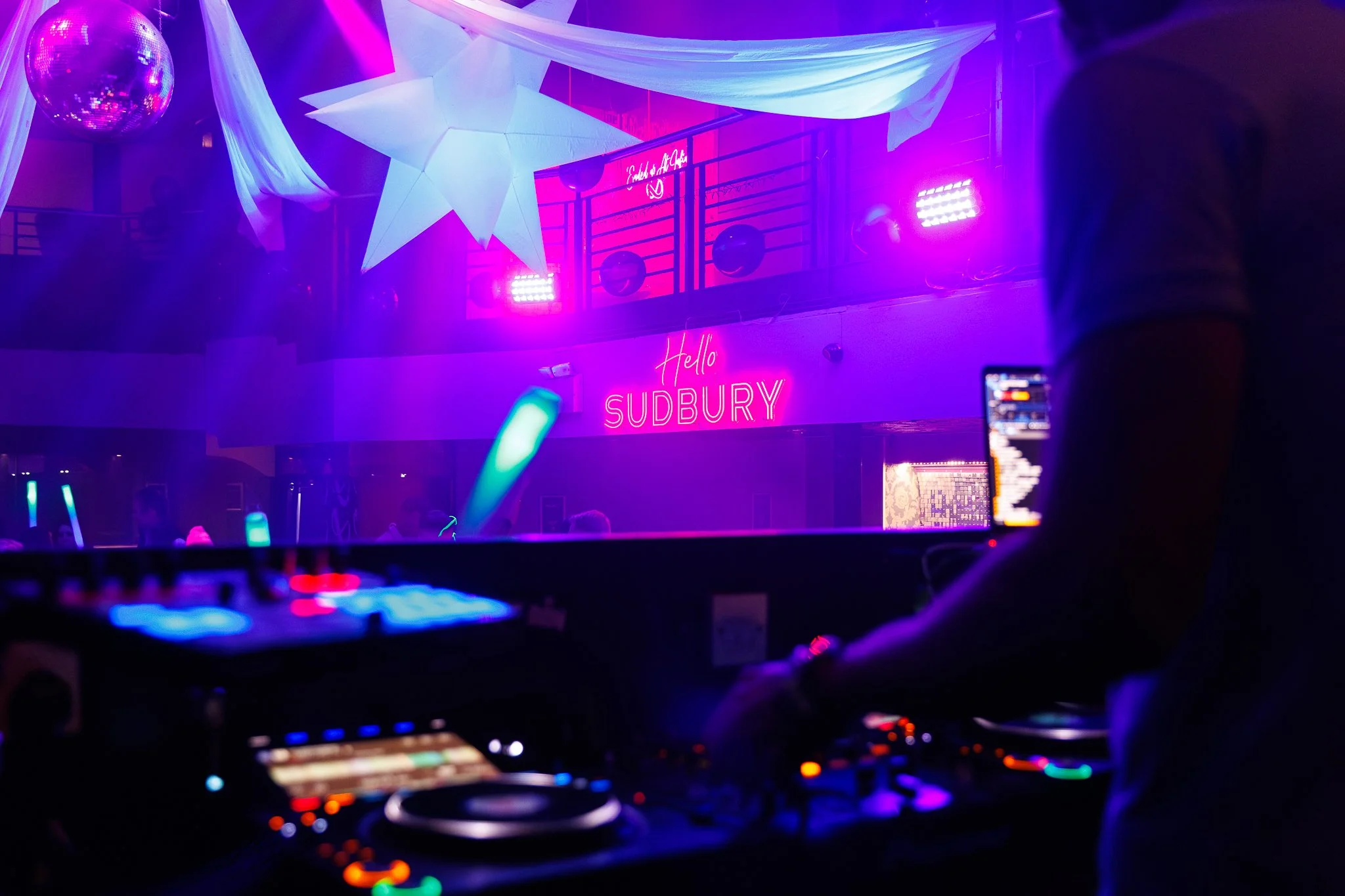 Two men smiling in a nightclub, with DJ equipment and a colorful background.