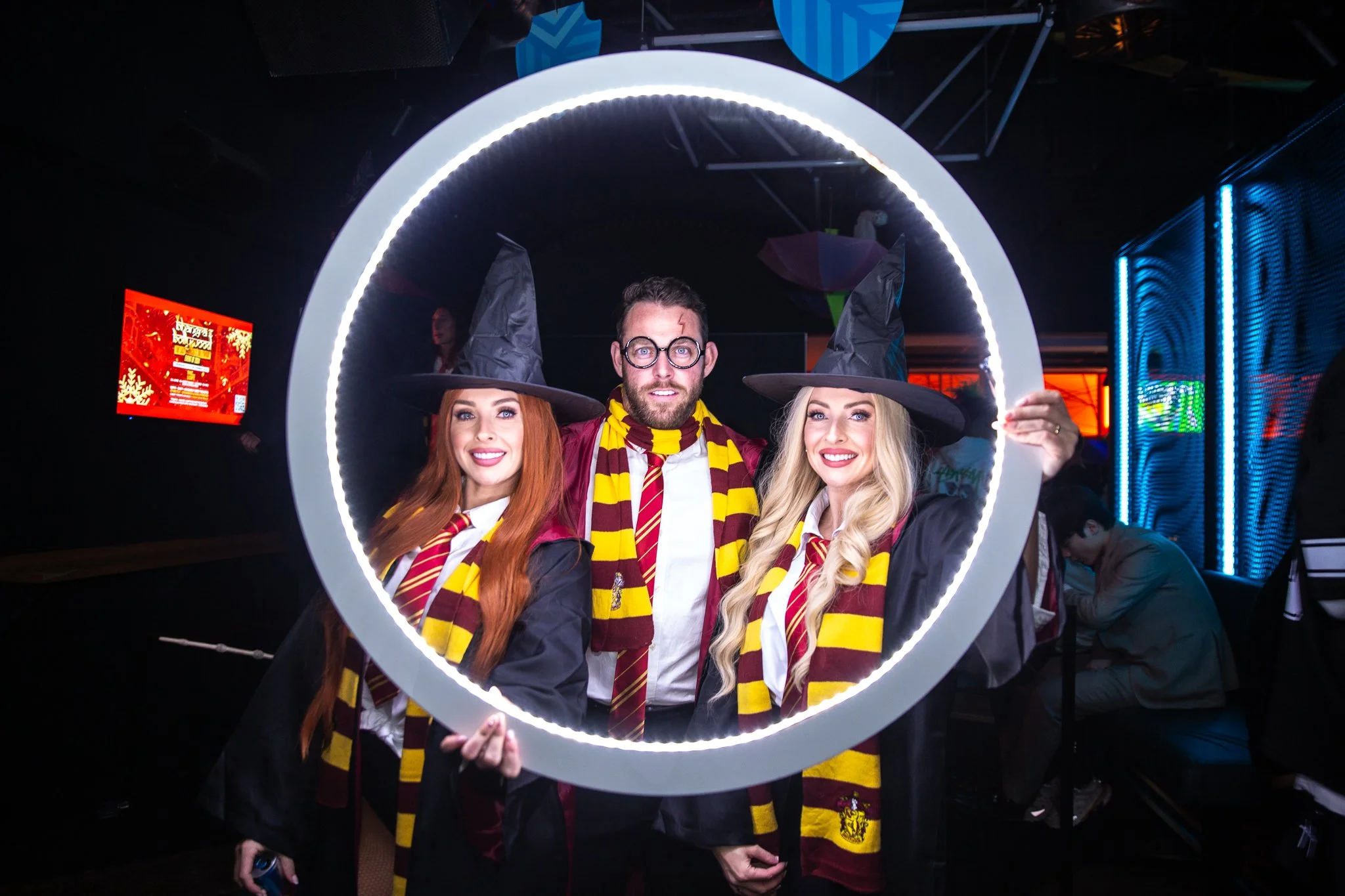 Three people dressed in wizard-themed costumes with hats and scarves, standing inside a large circular light ring at an event.