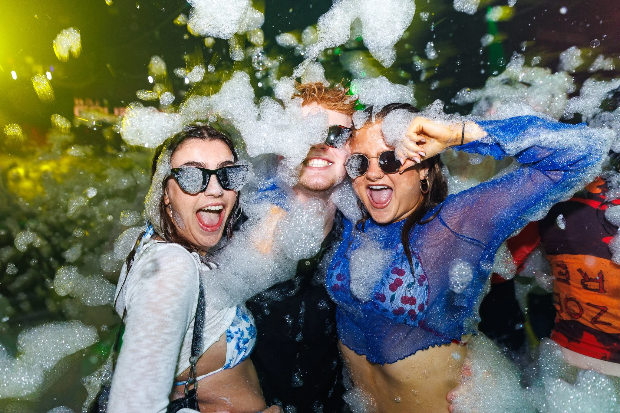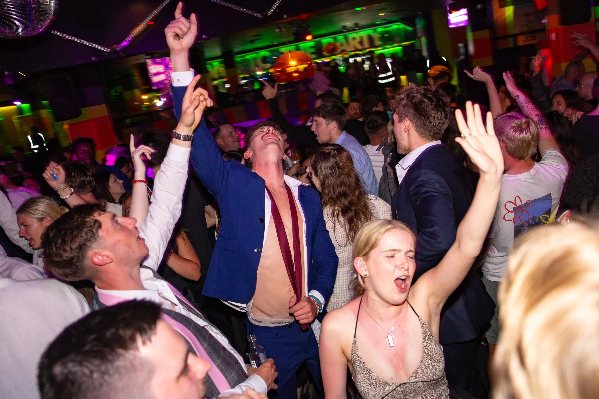 People dancing and celebrating in a lively, crowded nightclub with colorful lights.