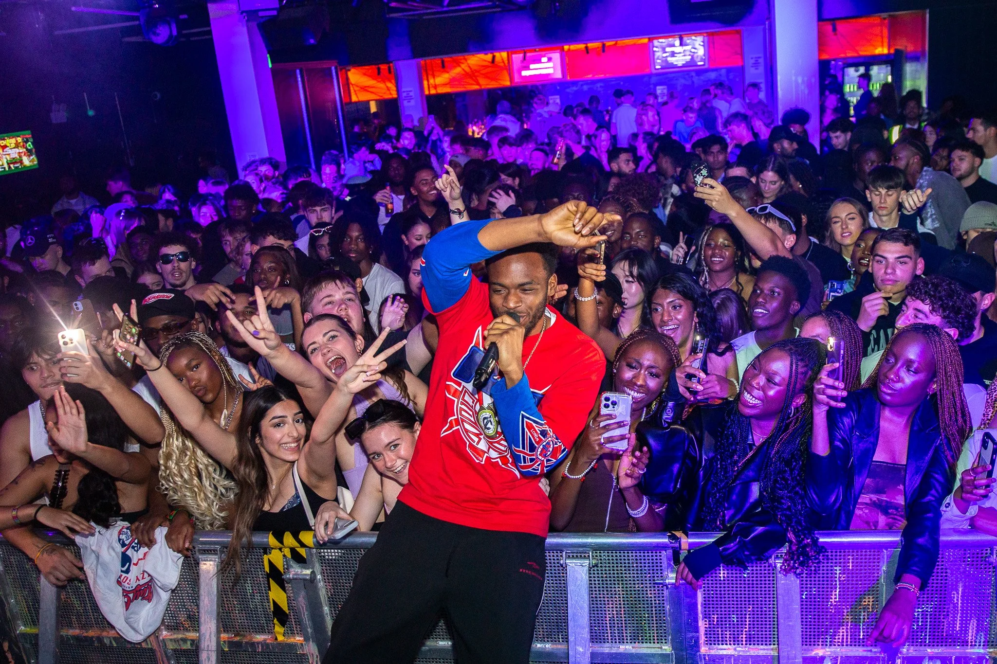 A lively concert with a performer wearing a red shirt singing to an energetic crowd. Fans are taking photos and enjoying the music in a vibrant club setting with colorful lighting.