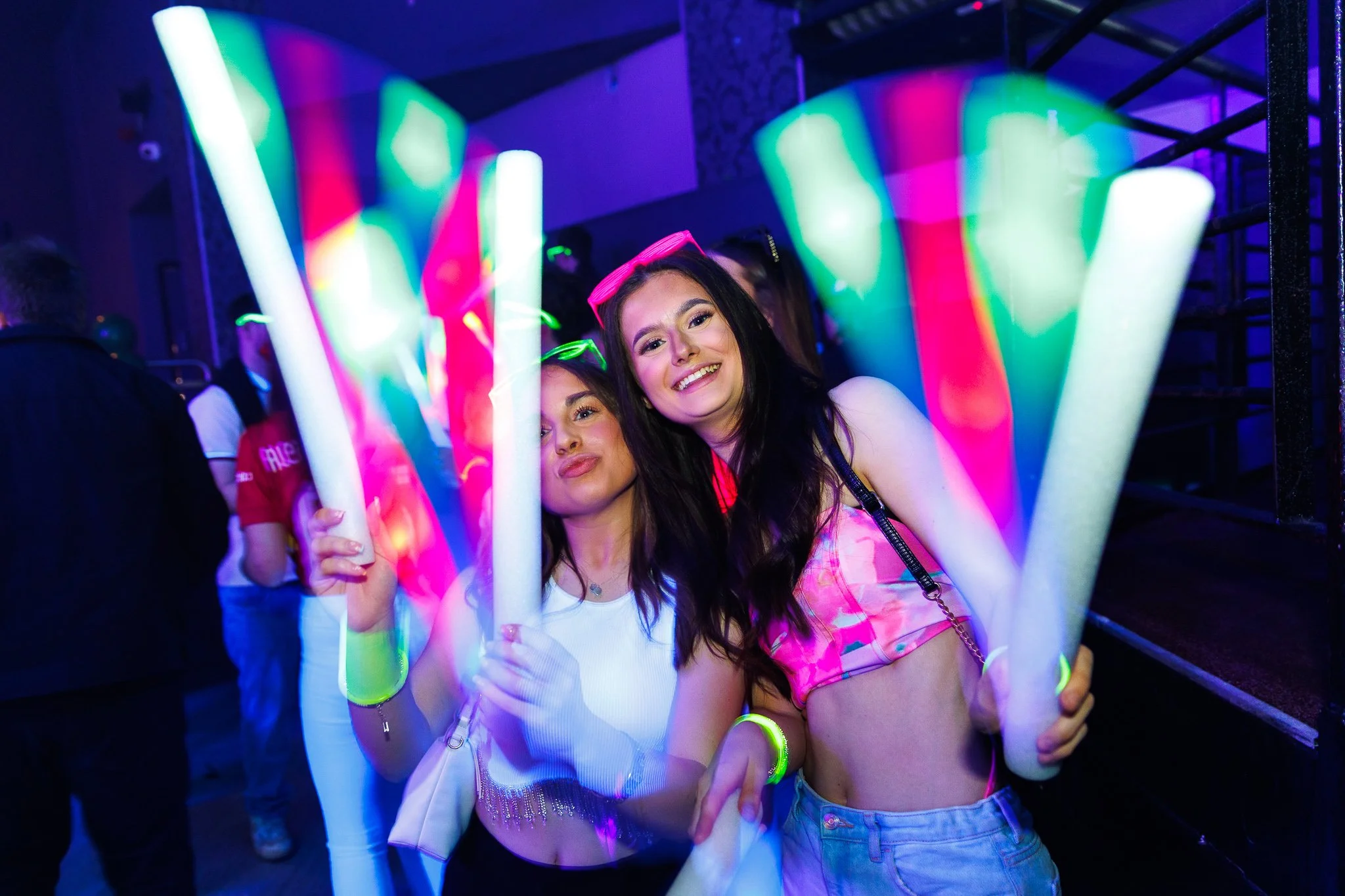 Two young women smiling at a nightclub, one holding a drink with a black straw, surrounded by people in the background and blue lighting.