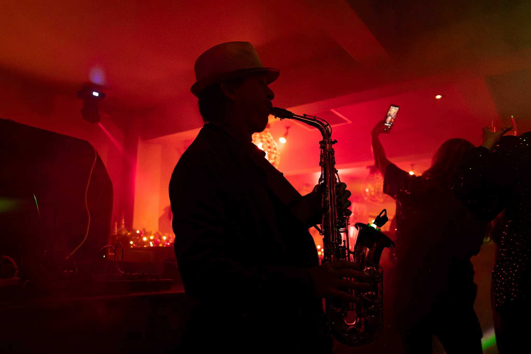 Silhouette of a saxophone player in a dimly lit, red-hued nightclub with people dancing and taking photos in the background.