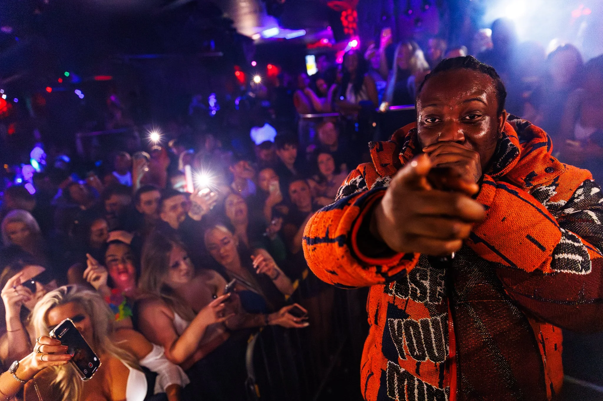 Crowded nightclub scene with a performer on stage, audience with smartphones taking photos, colorful lights, and lively atmosphere.