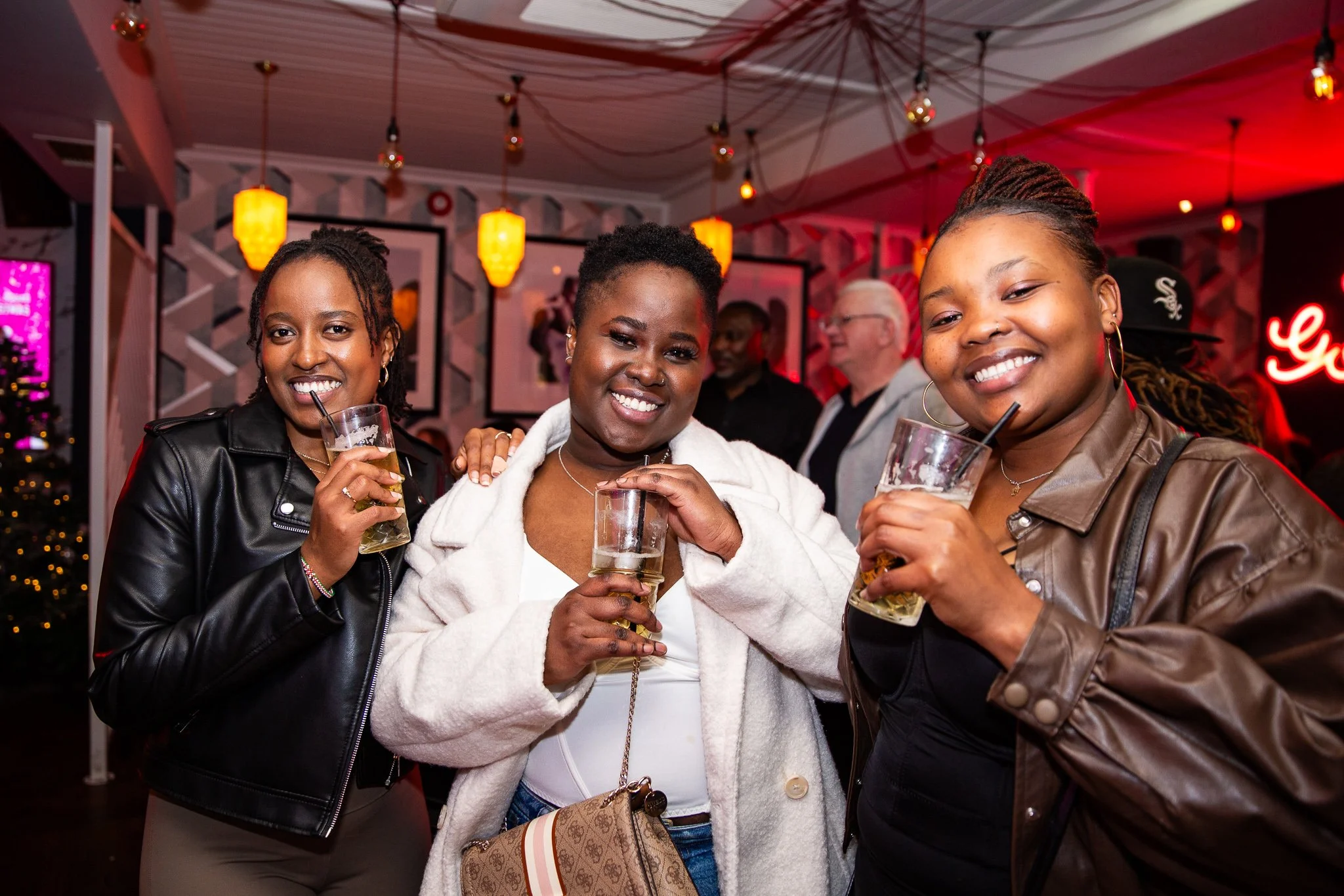 Three people smiling and holding drinks in a lively bar setting with hanging lights and framed art on the walls.